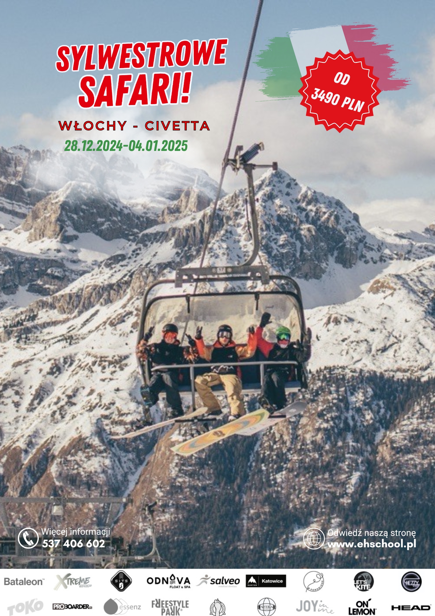 * Jeżeli zdecydujesz się na zakup naszych szkoleń snowboardowo-narciarskich, zalecamy również nabycie skipassu Dolomiti + Civetta, aby w pełni korzystać z możliwości, jakie oferują te regiony i korzystać z codziennych szkoleń.