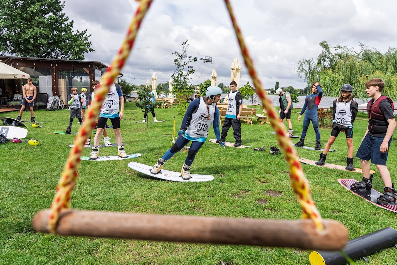 Poza wodą też działamy: trampolina z deską, trickboard, gyroboard, balance bar – wszystko po to, żebyś lepiej czuł się na wodzie i robił lepsze triki.